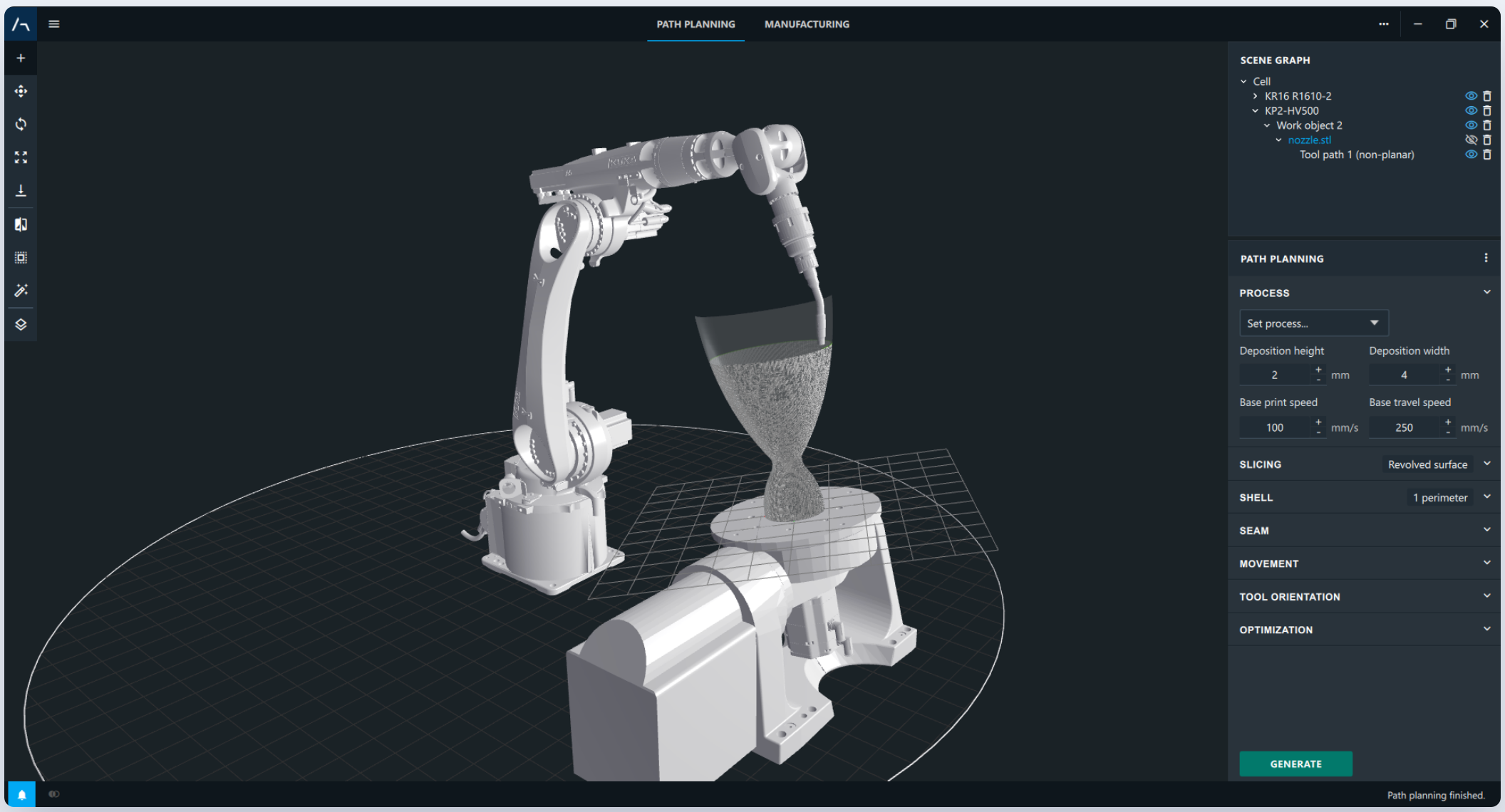 In order to generate toolpaths and instructions for a robotic printing cell, there are several software options. Each software option will provide various levels of control and print processing capabilities. Any software choice should be evaluated against the proposed print objects and application desired. For example, do you intend to do advanced nonplanar toolpaths, or produce parts in a traditional XYZ horizontal deposition method?
